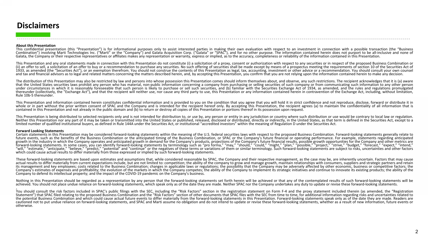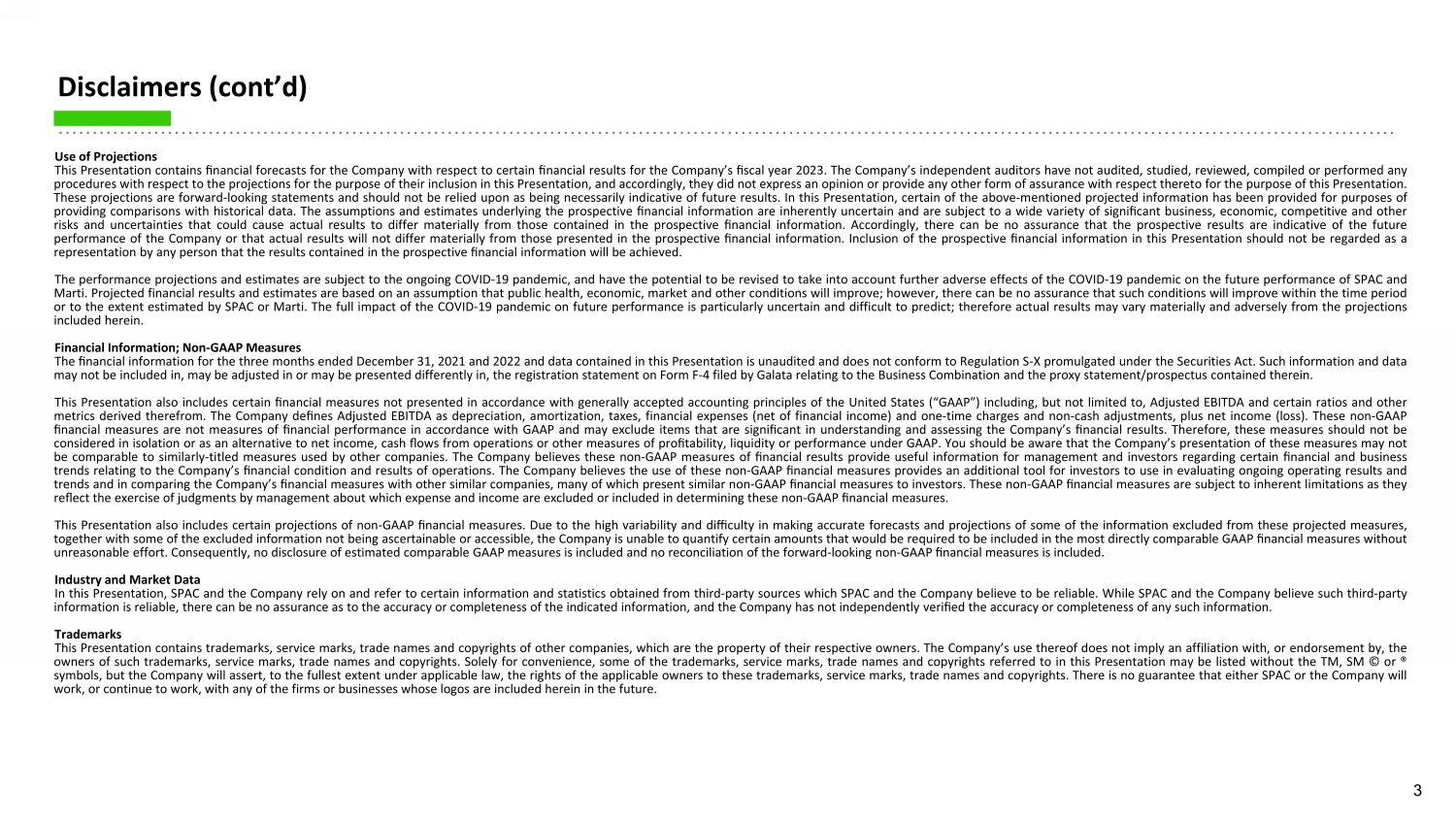 Use of Projections This Presentation contains financial forecasts for the Company with respect to certain financial results for the Company’s fiscal year 2023 . The Company’s independent auditors have not audited, studied, reviewed, compiled or performed any procedures with respect to the projections for the purpose of their inclusion in this Presentation, and accordingly, they did not express an opinion or provide any other form of assurance with respect thereto for the purpose of this Presentation . These projections are forward - looking statements and should not be relied upon as being necessarily indicative of future results . In this Presentation, certain of the above - mentioned projected information has been provided for purposes of providing comparisons with historical data . The assumptions and estimates underlying the prospective financial information are inherently uncertain and are subject to a wide variety of significant business, economic, competitive and other risks and uncertainties that could cause actual results to differ materially from those contained in the prospective financial information . Accordingly, there can be no assurance that the prospective results are indicative of the future performance of the Company or that actual results will not differ materially from those presented in the prospective financial information . Inclusion of the prospective financial information in this Presentation should not be regarded as a representation by any person that the results contained in the prospective financial information will be achieved . The performance projections and estimates are subject to the ongoing COVID - 19 pandemic, and have the potential to be revised to take into account further adverse effects of the COVID - 19 pandemic on the future performance of SPAC and Marti . Projected financial results and estimates are based on an assumption that public health, economic, market and other conditions will improve ; however, there can be no assurance that such conditions will improve within the time period or to the extent estimated by SPAC or Marti . The full impact of the COVID - 19 pandemic on future performance is particularly uncertain and difficult to predict ; therefore actual results may vary materially and adversely from the projections included herein . Financial Information ; Non - GAAP Measures The financial information for the three months ended December 31 , 2021 and 2022 and data contained in this Presentation is unaudited and does not conform to Regulation S - X promulgated under the Securities Act . Such information and data may not be included in, may be adjusted in or may be presented differently in, the registration statement on Form F - 4 filed by Galata relating to the Business Combination and the proxy statement/prospectus contained therein . This Presentation also includes certain financial measures not presented in accordance with generally accepted accounting principles of the United States (“GAAP”) including, but not limited to, Adjusted EBITDA and certain ratios and other metrics derived therefrom . The Company defines Adjusted EBITDA as depreciation , amortization , taxes , financial expenses (net of financial income ) and one - time charges and non - cash adjustments , plus net income ( loss ) . These non - GAAP financial measures are not measures of financial performance in accordance with GAAP and may exclude items that are significant in understanding and assessing the Company’s financial results . Therefore, these measures should not be considered in isolation or as an alternative to net income, cash flows from operations or other measures of profitability, liquidity or performance under GAAP . You should be aware that the Company’s presentation of these measures may not be comparable to similarly - titled measures used by other companies . The Company believes these non - GAAP measures of financial results provide useful information for management and investors regarding certain financial and business trends relating to the Company’s financial condition and results of operations . The Company believes the use of these non - GAAP financial measures provides an additional tool for investors to use in evaluating ongoing operating results and trends and in comparing the Company’s financial measures with other similar companies, many of which present similar non - GAAP financial measures to investors . These non - GAAP financial measures are subject to inherent limitations as they reflect the exercise of judgments by management about which expense and income are excluded or included in determining these non - GAAP financial measures . This Presentation also includes certain projections of non - GAAP financial measures . Due to the high variability and difficulty in making accurate forecasts and projections of some of the information excluded from these projected measures, together with some of the excluded information not being ascertainable or accessible, the Company is unable to quantify certain amounts that would be required to be included in the most directly comparable GAAP financial measures without unreasonable effort . Consequently, no disclosure of estimated comparable GAAP measures is included and no reconciliation of the forward - looking non - GAAP financial measures is included . Industry and Market Data In this Presentation, SPAC and the Company rely on and refer to certain information and statistics obtained from third - party sources which SPAC and the Company believe to be reliable . While SPAC and the Company believe such third - party information is reliable, there can be no assurance as to the accuracy or completeness of the indicated information, and the Company has not independently verified the accuracy or completeness of any such information . Trademarks This Presentation contains trademarks, service marks, trade names and copyrights of other companies, which are the property of their respective 