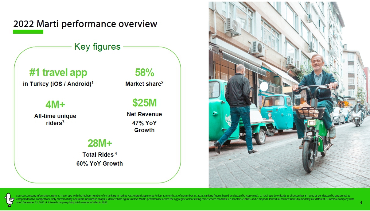 Going into the fourth quarter, Marti was the only mobility app in Turkey offering e-scooters, e-bikes, and e-mopeds. With the launch of its car-pooling service, Marti continues its role as the market leader in Turkey and is now able to offer a full range of mobility services to its customers through multiple transportation options based on destination distance, availability of public transportation, cost, and time of day.