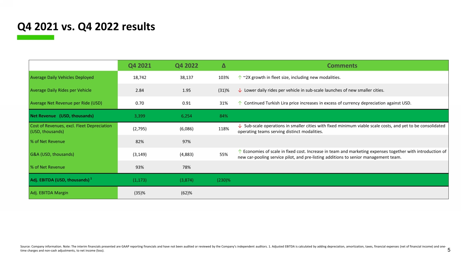 Operating expenses as a share of net revenue increased due to the launch of sub-scale operations in new markets. In addition, the launch of Marti’s car-pooling service, including related marketing and personnel costs, contributed to a decrease in Adjusted EBITDA of $2.7 million to $(3.9) million in Q4’22.