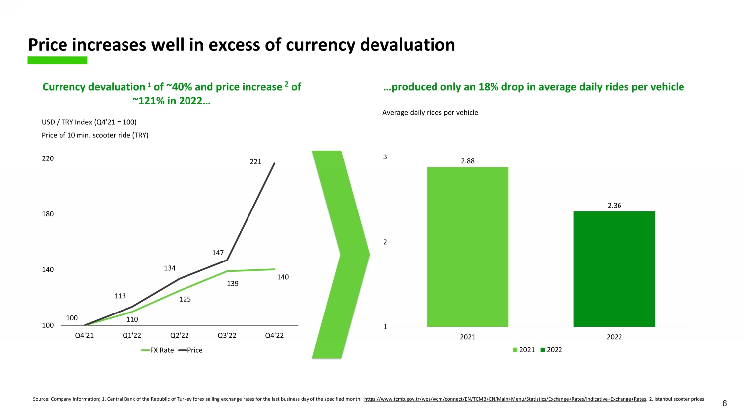 | · | Prices increased by 121% compared to 2021, significantly exceeding the 40% currency depreciation of the Turkish lira relative to the U.S. dollar during the same period. Average daily rides per vehicle decreased 18% compared to 2021. |