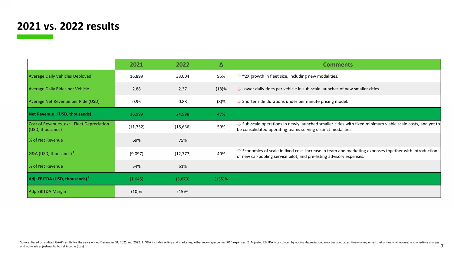 7 2021 2022 ∆ Comments Average Daily Vehicles Deployed 16,899 33,004 95% ↑ ~ 2 X growth in fleet size, including new modalities . Average Daily Rides per Vehicle 2.88 2.37 (18)% ↓ Lower daily rides per vehicle in sub - scale launches of new smaller cities. Average Net Revenue per Ride (USD) 0.96 0.88 (8)% ↓ Shorter ride durations under per minute pricing model. Net Revenue (USD, thousands ) 16,999 24,998 47% Cost of Revenues , excl. Fleet Depreciation (USD, thousands ) (11,752) (18,636) 59% ↓ Sub - scale operations in newly launched smaller cities with fixed minimum viable scale costs, and yet to be consolidated operating teams serving distinct modalities. % of Net Revenue 69% 75% G&A (USD, thousands ) 1 (9,097) (12,777) 40% ↑ Economies of scale in fixed cost . Increase in team and marketing expenses together with introduction of new car - pooling service pilot, and pre - listing advisory expenses . % of Net Revenue 54% 51% Adj. EBITDA (USD, thousands ) 2 (1,645) (3,873) (135)% Adj. EBITDA Margin (10)% (15)% 202 1 vs. 202 2 results Source: Based on audited GAAP results for the years ended December 31, 2021 and 2022 . 1. G&A includes selling and marketing; other income / expense , R&D expenses . 2. Adjusted EBITDA is calculated by adding depreciation, amortization, taxes, financial expenses (net of financial income) and o ne - time charges and non - cash adjustments, to net income (loss) .