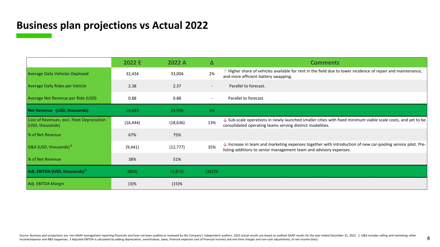 8 2022 E 202 2 A ∆ Comments Average Daily Vehicles Deployed 32,434 33,004 2% ↑ Higher share of vehicles available for rent in the field due to lower incidence of repair and maintenance , and more efficient battery swapping . Average Daily Rides per Vehicle 2.38 2.37 - Parallel to forecast . Average Net Revenue per Ride (USD) 0.88 0.88 - Parallel to forecast . Net Revenue (USD, thousands ) 24,683 24,998 1% Cost of Revenues , excl. Fleet Depreciation (USD, thousands ) (16,444) (18,636) 13% ↓ Sub - scale operations in newly launched smaller cities with fixed minimum viable scale costs, and yet to be consolidated operating teams serving distinct modalities. % of Net Revenue 67% 75% G&A (USD, thousands ) 1 (9,441) (12,777) 35% ↓ Increase in team and marketing expenses together with introduction of new car - pooling service pilot. Pre - listing additions to senior management team and advisory expenses. % of Net Revenue 38% 51% Adj. EBITDA (USD, thousands ) 2 (804) (3,873) (382)% Adj. EBITDA Margin (3)% (15)% B usiness plan projections vs Actual 2022 Source: Business plan projections are non - GAAP management reporting financials and have not been audited or reviewed by the Company’s independent auditors . 2022 actual results are b ased on audited GAAP results for the year ended December 31, 2022 . 1. G&A includes selling and marketing; other income / expense and R&D exppenses . 2 Adjusted EBITDA is calculated by adding depreciation, amortization, taxes, financial expenses (net of financial income) and o ne - time charges and non - cash adjustments, to net income (loss) .