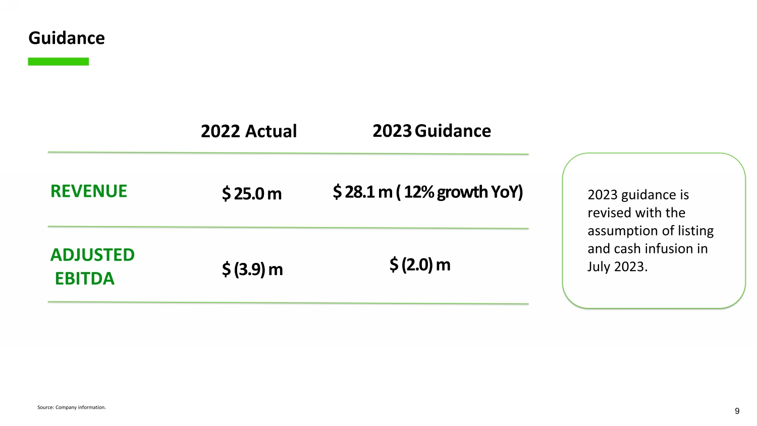9 Guidance 2022 Actual 2023 Guidance REVENUE ADJUSTED EBITDA $ 25 . 0 m $ 28 . 1 m ( 12 % growth YoY ) $ ( 3 . 9 ) m $ ( 2 . 0 ) m Source: Company information . 2023 guidance is revised with the assumption of listing and cash infusion in July 2023 .