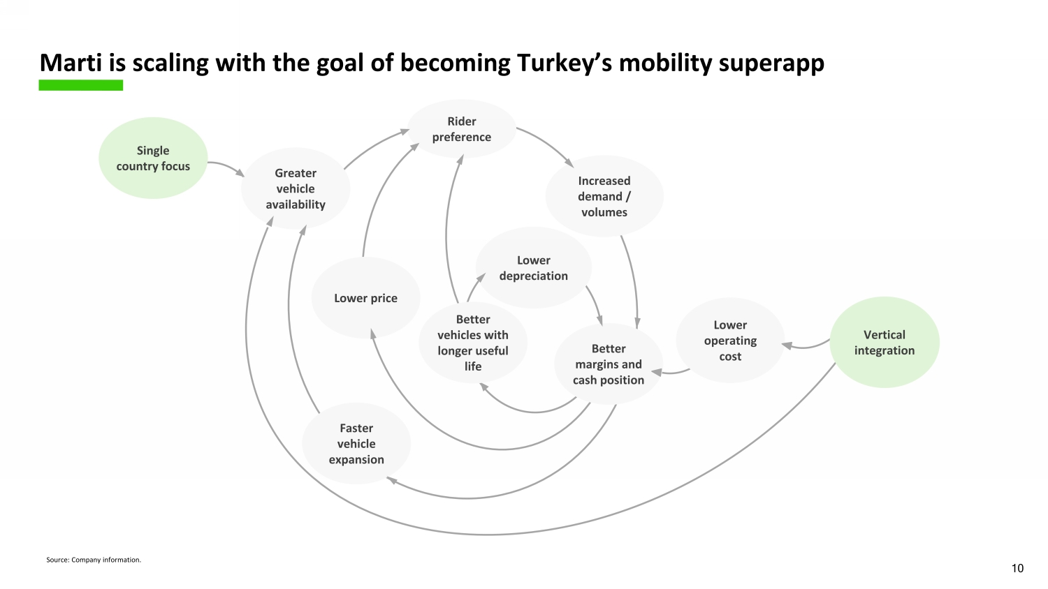 Lower depreciation Single country focus Greater vehicle availability Lower operating cost Rider preference Increased demand / volumes Lower price Better margins and cash position Faster vehicle expansion Better vehicles with longer useful life Vertical integration 10 Marti is scaling with the goal of becoming Turkey’s mobility superapp Source: Company information.