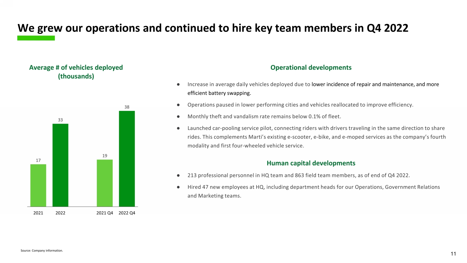 11 We grew our operations and continued to hire key team members in Q 4 2022 ● Increase in average daily vehicles deployed due to lower incidence of repair and maintenance , and more efficient battery swapping . ● Operations paused in lower performing cities and vehicles reallocated to improve efficiency . ● M onthly theft and vandalism rate remains below 0.1% of fleet . ● Launched car - pooling service pilot, connecting riders with drivers traveling in the same direction to share rides . This complements Marti’s existing e - scooter, e - bike , and e - moped services as the company’s fourth modality and first four - wheeled vehicle service. ● 213 professional personnel in HQ team and 863 field team members, as of end of Q 4 2022. ● Hired 47 new employees at HQ , including department heads for our Operations, Government Relations and Marketing teams . Human capital developments Operational developments Average # of vehicles deployed ( thousands ) Source: Company information . 17 33 19 38 2021 2022 2021 Q4 2022 Q4