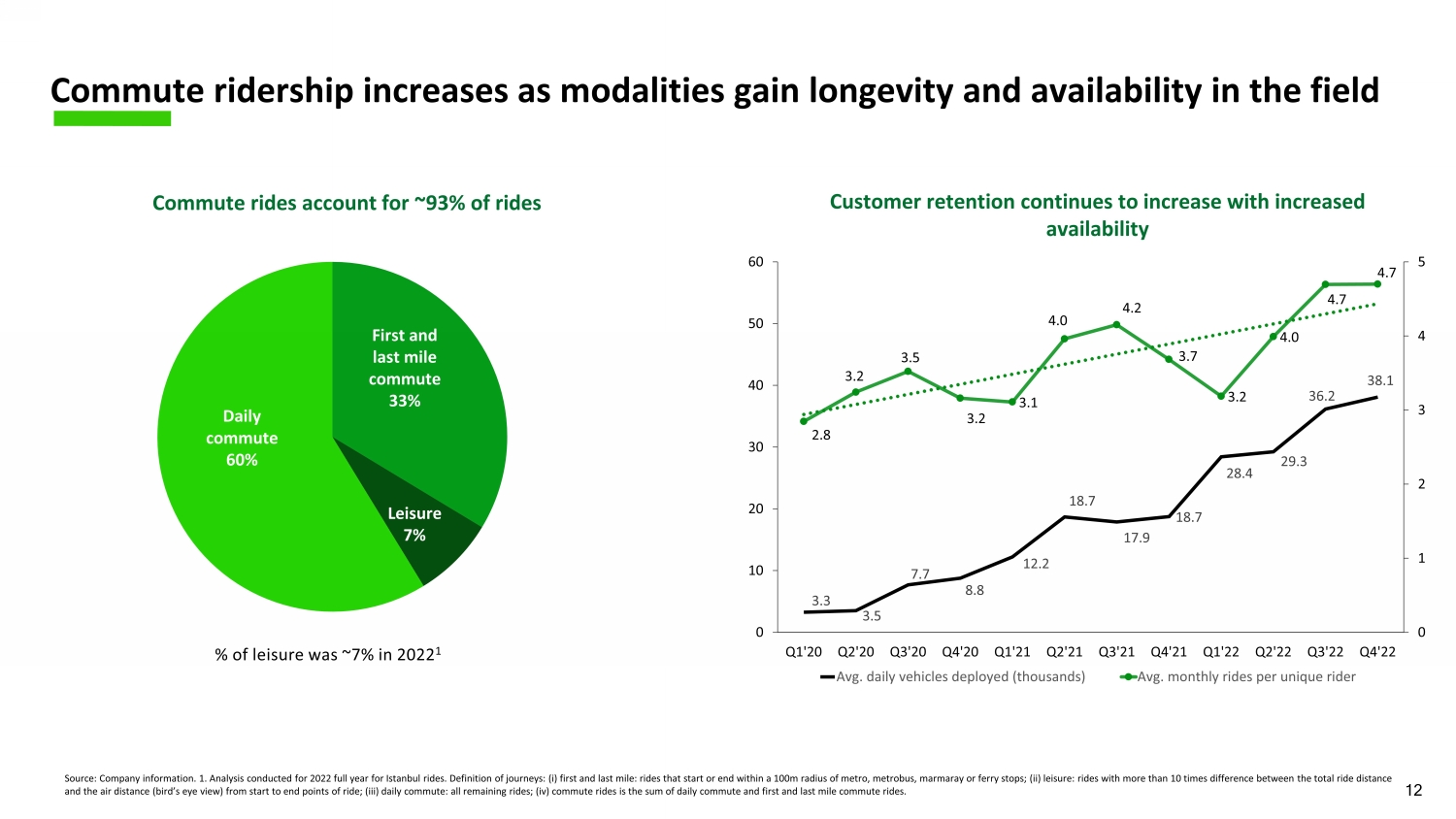 Customer retention continues to increase with increased availability Commute rides account for ~9 3 % of rides % of leisure was ~ 7 % in 2022 1 Commute ridership increases as modalities gain longevity and availability in the field 12 Daily commute 60 % First and last mile commute 3 3 % Leisure 7 % Source: Company information. 1. Analysis conducted for 2022 full year for Istanbul rides. Definition of journeys : (i) first and last mile: rides that start or end with in a 100m radius of metro, metrobus, m armara y or ferry stops; (ii) leisure: r ides with more than 10 times difference between the total ride distance and the air distance (bird’s eye view) from start to end points of rid e; (iii) daily c ommute : all remaining rides ; (iv) commute rides is the sum of daily commute and first and last mile commute rides . 3.3 3.5 7.7 8.8 12.2 18.7 17.9 18.7 28.4 29.3 36.2 38.1 2.8 3.2 3.5 3.2 3.1 4.0 4.2 3.7 3.2 4.0 4.7 4.7 0 1 2 3 4 5 0 10 20 30 40 50 60 Q1'20 Q2'20 Q3'20 Q4'20 Q1'21 Q2'21 Q3'21 Q4'21 Q1'22 Q2'22 Q3'22 Q4'22 Avg. daily vehicles deployed (thousands) Avg. monthly rides per unique rider