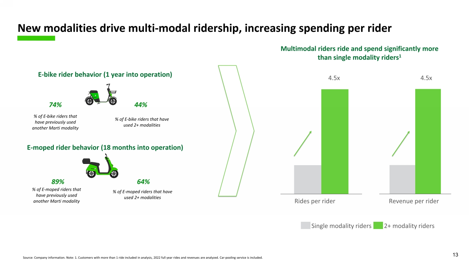 13 E - bike rider behavior (1 year into operation ) % of E - bike riders that have used 2+ modalities % of E - bike riders that have previously used another Marti modality 44 % 74 % E - moped rider behavior (18 months into operation ) % of E - moped riders that have previously used another Marti modality 64 % 89 % % of E - moped riders that have used 2+ modalities Multimodal riders ride and spend significantly more than single modality riders 1 Revenue per rider 4.5 x Rides per rider 4.5x Single modality riders 2+ modality riders New modalities drive multi - modal ridership, increasing spending per rider Source: Company information . Note: 1 . Customers with more than 1 ride included in analysis , 2022 full year rides and revenues are analyzed. Car - pooling service is included .