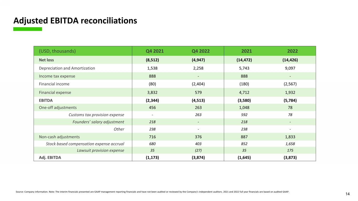 14 Adjusted EBITDA reconciliations Source: Company information. Note : The interim financials presented are GAAP management reporting financials and have not been audited or reviewed by the Company’s independent auditors . 2021 and 2022 full year financials are b ased on audited GAAP . ( USD, thousands ) Q4 2021 Q4 2022 2021 2022 Net loss (8,512) (4,947) (14,472) (14,426) Depreciation and Amortization 1,538 2,258 5,743 9,097 Income tax expense 888 - 888 - Financial income (80) (2,404) (180) (2,567) Financial expense 3,832 579 4,712 1,932 EBITDA (2,344) (4,513) (3,580) (5,784) One - off adjustments 456 263 1,048 78 Customs tax provision expense - 263 592 78 Founders ’ salary adjustment 218 - 218 - Other 238 - 238 - Non - cash adjustments 716 376 887 1,833 Stock based compensation expense accrual 680 403 852 1,658 Lawsuit provision expense 35 (27) 35 175 Adj . EBITDA (1,173) (3,874) (1,645) (3,873)