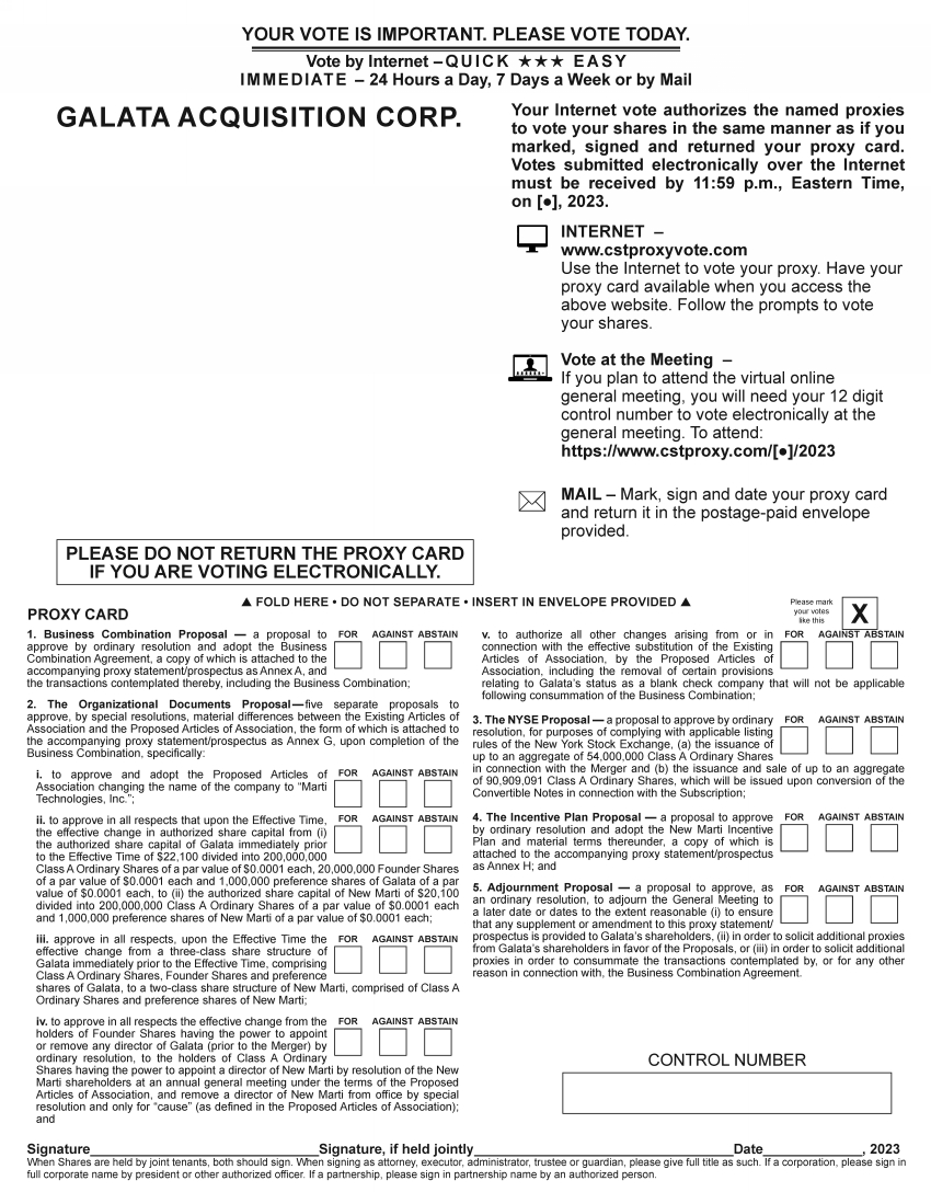 GALATA ACQUISITION CORP. PLEASE DO NOT RETURN THE PROXY CARD IF YOU ARE VOTING ELECTRONICALLY. 22504 Galata Acq. Proxy Card Front YOUR VOTE IS IMPORTANT. PLEASE VOTE TODAY. IMMEDIATE - 24 Hours a Day, 7 Days a Week or by Mail Vote by Internet - QUICK EASY FOLD HERE • DO NOT SEPARATE • INSERT IN ENVELOPE PROVIDED CONTROL NUMBER SignatureSignature, if held jointlyDate, 2023 When Shares are held by joint tenants, both should sign. When signing as attorney, executor, administrator, trustee or guardian, please give full title as such. If a corporation, please sign in full corporate name by president or other authorized officer. If a partnership, please sign in partnership name by an authorized person. 1. Business Combination Proposal — a proposal to approve by ordinary resolution and adopt the Business Combination Agreement, a copy of which is attached to the accompanying proxy statement/prospectus as Annex A, and the transactions contemplated thereby, including the Business Combination; 2. The Organizational Documents Proposal — five separate proposals to approve, by special resolutions, material differences between the Existing Articles of Association and the Proposed Articles of Association, the form of which is attached to the accompanying proxy statement/prospectus as Annex G, upon completion of the Business Combination, specifically: i. to approve and adopt the Proposed Articles of Association changing the name of the company to “Marti Technologies, Inc.”; ii. to approve in all respects that upon the Effective Time, the effective change in authorized share capital from (i) the authorized share capital of Galata immediately prior to the Effective Time of $22,100 divided into 200,000,000 Class A Ordinary Shares of a par value of $0.0001 each, 20,000,000 Founder Shares of a par value of $0.0001 each and 1,000,000 preference shares of Galata of a par value of $0.0001 each, to (ii) the authorized share capital of New Marti of $20,100 divided into 200,000,000 Class A Ordinary Shares of a par value of $0.0001 each and 1,000,000 preference shares of New Marti of a par value of $0.0001 each; iii. approve in all respects, upon the Effective Time the effective change from a three-class share structure of Galata immediately prior to the Effective Time, comprising Class A Ordinary Shares, Founder Shares and preference shares of Galata, to a two-class share structure of New Marti, comprised of Class A Ordinary Shares and preference shares of New Marti; iv. to approve in all respects the effective change from the holders of Founder Shares having the power to appoint or remove any director of Galata (prior to the Merger) by ordinary resolution, to the holders of Class A Ordinary Shares having the power to appoint a director of New Marti by resolution of the New Marti shareholders at an annual general meeting under the terms of the Proposed Articles of Association, and remove a director of New Marti from office by special resolution and only for “cause” (as defined in the Proposed Articles of Association); and v. to authorize all other changes arising from or in connection with the effective substitution of the Existing Articles of Association, by the Proposed Articles of Association, including the removal of certain provisions relating to Galata’s status as a blank check company that will not be applicable following consummation of the Business Combination; 3. The NYSE Proposal — a proposal to approve by ordinary resolution, for purposes of complying with applicable listing rules of the New York Stock Exchange, (a) the issuance of up to an aggregate of 54,000,000 Class A Ordinary Shares in connection with the Merger and (b) the issuance and sale of up to an aggregate of 90,909,091 Class A Ordinary Shares, which will be issued upon conversion of the Convertible Notes in connection with the Subscription; 4. The Incentive Plan Proposal — a proposal to approve by ordinary resolution and adopt the New Marti Incentive Plan and material terms thereunder, a copy of which is attached to the accompanying proxy statement/prospectus as Annex H; and 5. Adjournment Proposal — a proposal to approve, as an ordinary resolution, to adjourn the General Meeting to a later date or dates to the extent reasonable (i) to ensure that any supplement or amendment to this proxy statement/ prospectus is provided to Galata’s shareholders, (ii) in order to solicit additional proxies from Galata’s shareholders in favor of the Proposals, or (iii) in order to solicit additional proxies in order to consummate the transactions contemplated by, or for any other reason in connection with, the Business Combination Agreement. PROXY CARD Please mark your votes like this X FOR AGAINST ABSTAIN INTERNET – www.cstproxyvote.com Use the Internet to vote your proxy. Have your proxy card available when you access the above website. Follow the prompts to vote your shares. Vote at the Meeting – If you plan to attend the virtual online general meeting, you will need your 12 digit control number to vote electronically at the general meeting. To attend: https://www.cstproxy.com/[●]/2023 MAIL – Mark, sign and date your proxy card and return it in the postage-paid envelope provided. Your Internet vote authorizes the named proxies to vote your shares in the same manner as if you marked, signed and returned your proxy card. Votes submitted electronically over the Internet must be received by 11:59 p.m., Eastern Time, on [●], 2023. FOR AGAINST ABSTAIN FOR AGAINST ABSTAIN FOR AGAINST ABSTAIN FOR AGAINST ABSTAIN FOR AGAINST ABSTAIN FOR AGAINST ABSTAIN FOR AGAINST ABSTAIN FOR AGAINST ABSTAIN